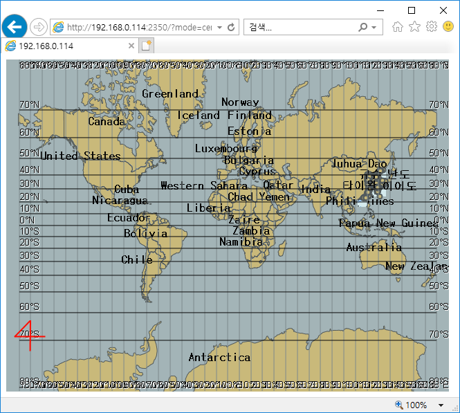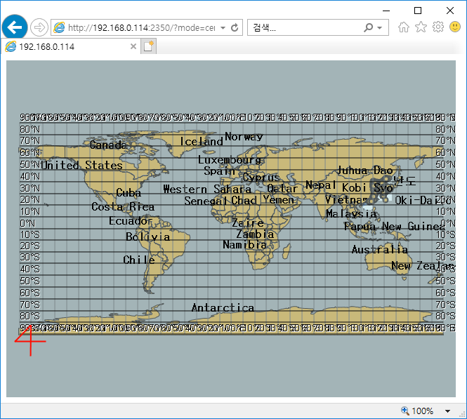 위경도 격자가 표시되고 있을 경우 위경도 값은 0, 90, 180, 270인 경우에만 표시됩니다.