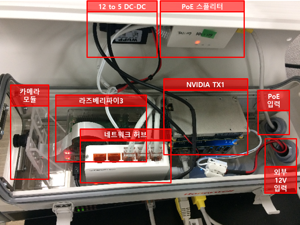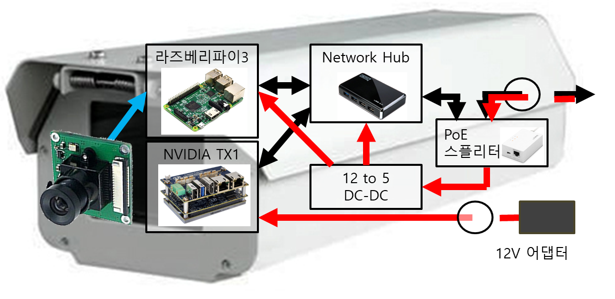 해상용 IP 카메라를 개발한 기술에 덧 붙여 카메라 내부에 딥러닝에 의한 객체 인식 모듈을 추가하여 에지 카메라를 구현한 과제입니다. 인식 모듈에는 GPU가 포함된 NVIDIA의 소형 컴퓨터인 JETSON TX1이 사용되었으며 다음 그림과 같은 구성으로 개발되었습니다.